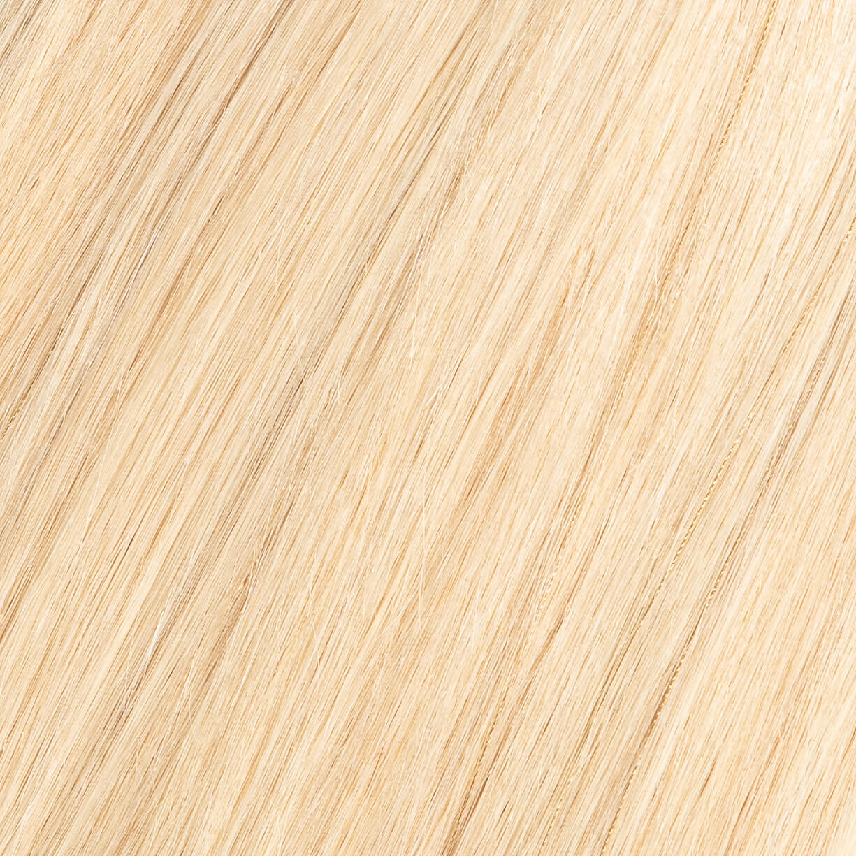 The brightest blonde, but with a neutral root color. We rooted this weft, so you won't have to! This root color sits at a neutral level 7 and the blonde goes WHITE within a couple of seconds of a sulfate free purple shampoo. Without toning the wefts they sit at a level 10 neutral blonde.